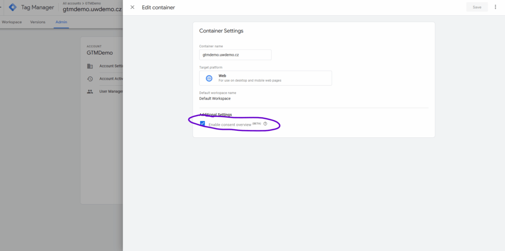 7. Enable “Consent Overview”: Check this box to enable your container to work with new consent-related features and parameters.