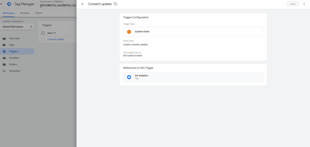 8. Create Consent Update Trigger: Create a new “Custom Event” trigger named cookie_consent_update. This trigger will respond to events when users change their cookie consent preferences.