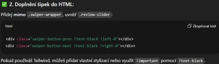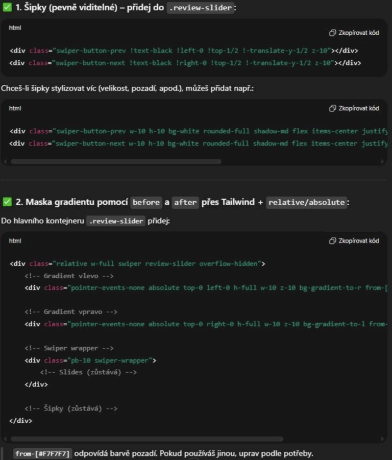 Since we needed navigation arrows in the slider, ChatGPT knew to add them to the HTML and reference them via JS parameters, which it did in the previous block. It also recognized we’re probably using Tailwind for styling, though it wasn’t certain. While we use Tailwind classes, the class names alone don’t confirm this—we could have a custom framework with similar naming conventions.
