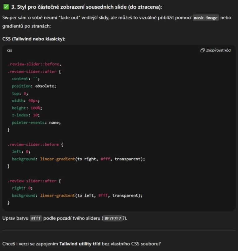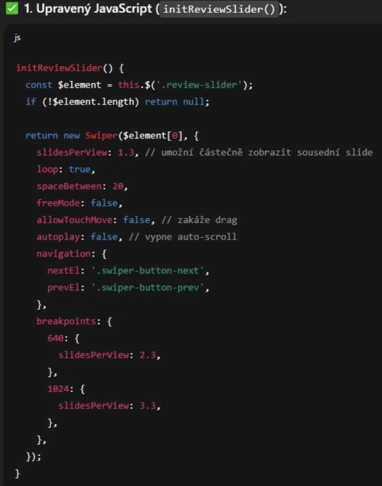 ChatGPT recognized my code was using the Swiper slider library. Since it knows this library, it understood which parameters to use and how to meet our requirements. We just need to watch the version the AI is working with—it might have been trained on an older library version than what’s in our project.