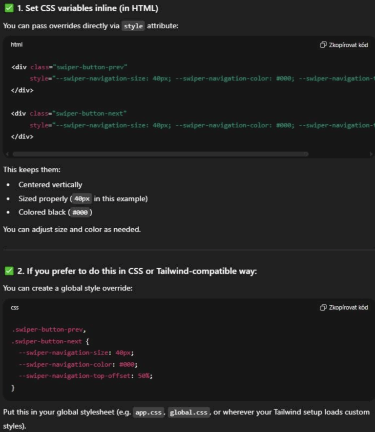 Finally, I wanted to refine some slider element styles that couldn’t be overridden with standard Tailwind classes. I asked ChatGPT for a solution with specific values for arrow size and color, and it beautifully offered two options—the second being ideal: overriding CSS variables in the CSS file.
